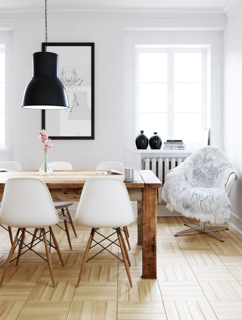 Styl skandynawski charakteryzuje się połączeniem różnych odcieni bieli z naturalnymi, kontrastującymi z nią elementami. Cechuje go prostota form oraz duża ilość dodatków, takich jak koce, pledy, poduszki, często w jasnych, stonowanych barwach. W prezentowanej jadalni staraliśmy się w pełni oddać piękno i prostotę skandynawskiego stylu. Widać tutaj minimalistyczne dekoracje, połączone z naturalnym elementami drewna oraz roślinnością. Nasz zespół jest w stanie wykonać wizualizację wnętrza na podstawie wykonanego projektu bądź bez niego. Często wystarczy szczegółowy opis, który pozwoli oddać wymarzone wnętrze w pełnej krasie. Dzięki wizualizacji klient ma możliwość dopracować swój pomysł na aranżację pomieszczenia, w tym kolorów oraz dodatków, bez konieczności ponoszenia dodatkowych kosztów związanych z ich zakupem.